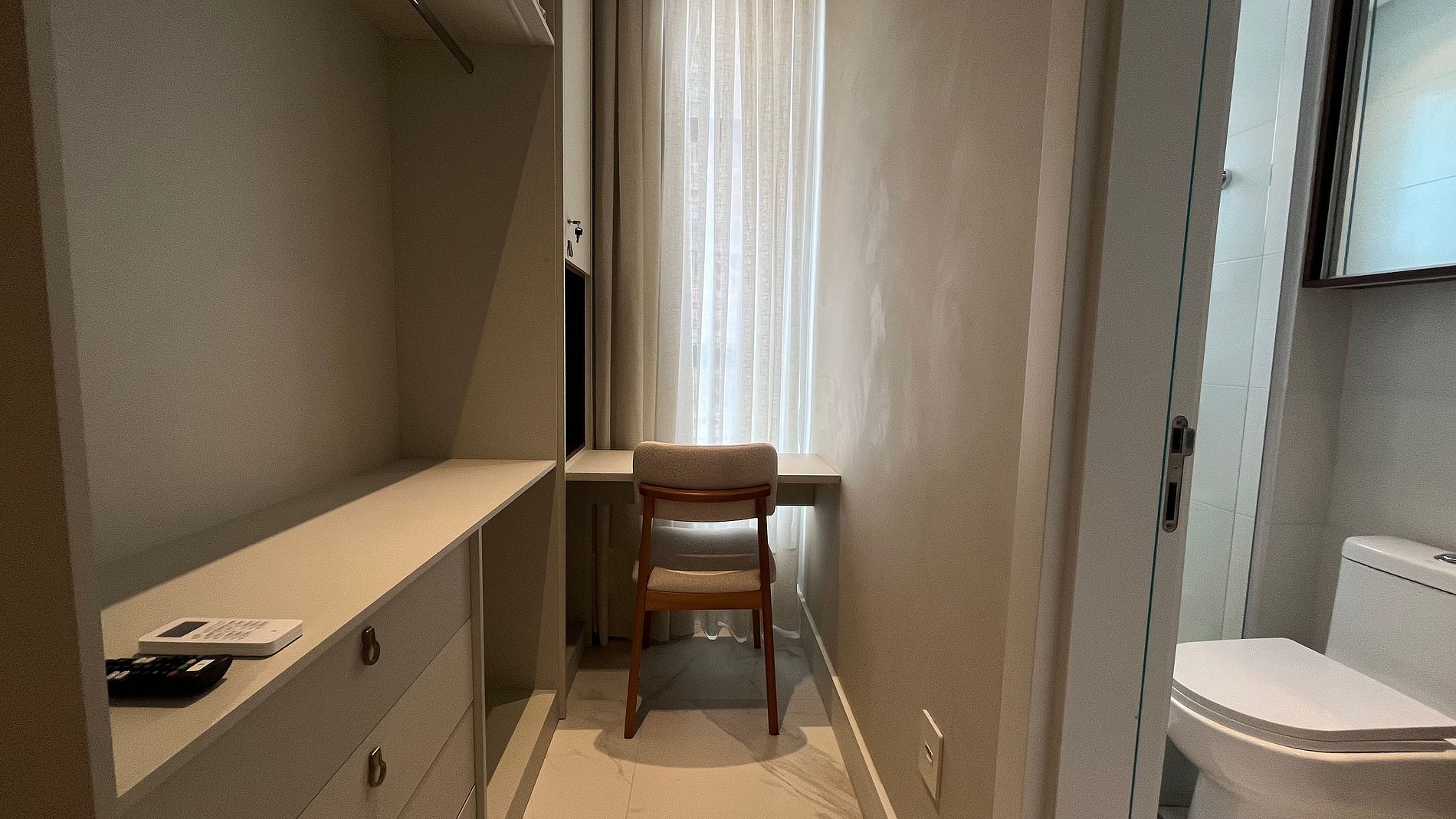 - 1 suíte com cama queen, smart tv, espaço para trabalho, mesas de cabeceiras, armário, arara para roupas e ar-condicionado;