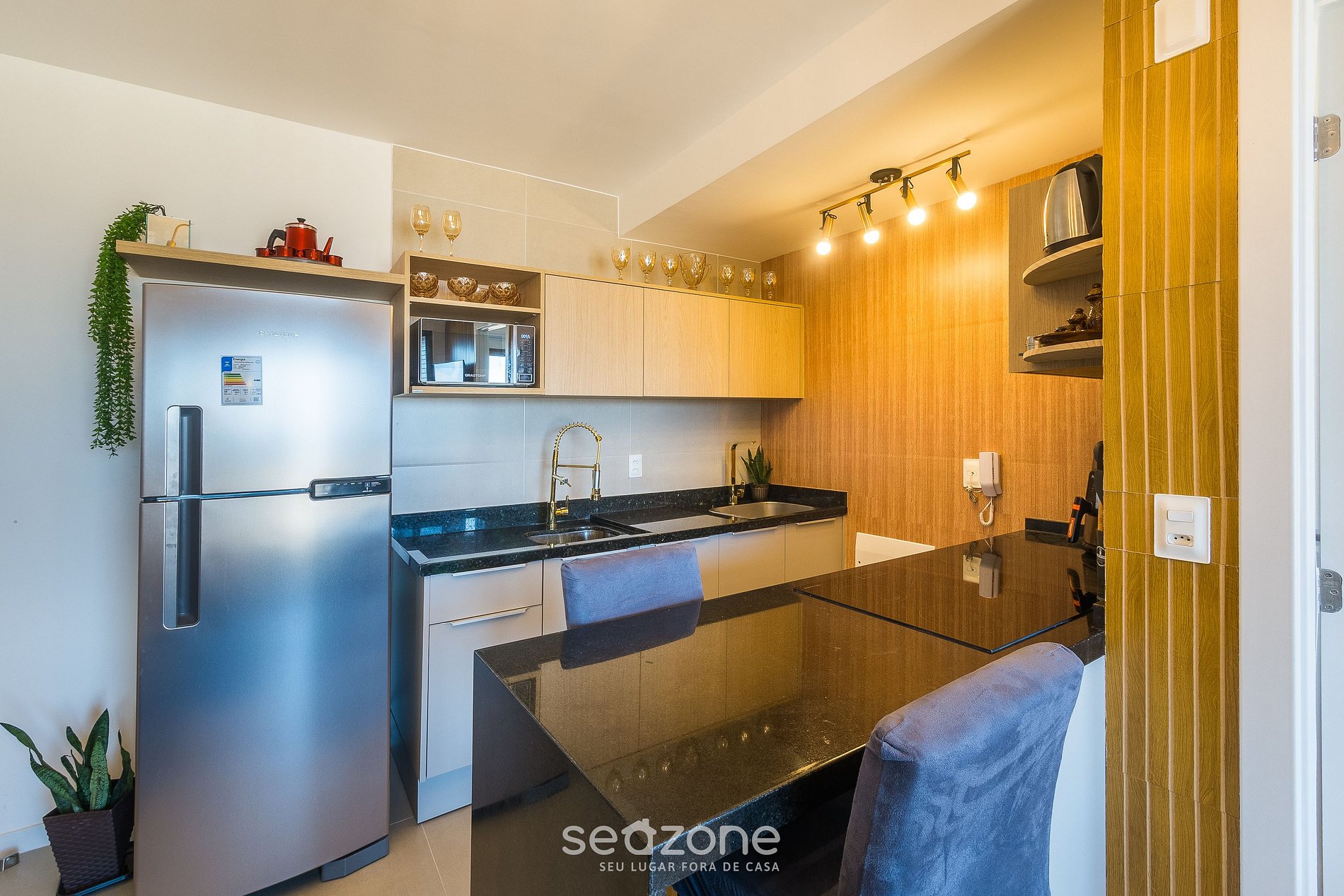 - Cozinha completa com geladeira, fogão por indução, forno elétrico, airfryer, micro-ondas, sanduicheira, chaleira elétrica, liquidificador, taças de vinho, panelas, louças e utensílios;