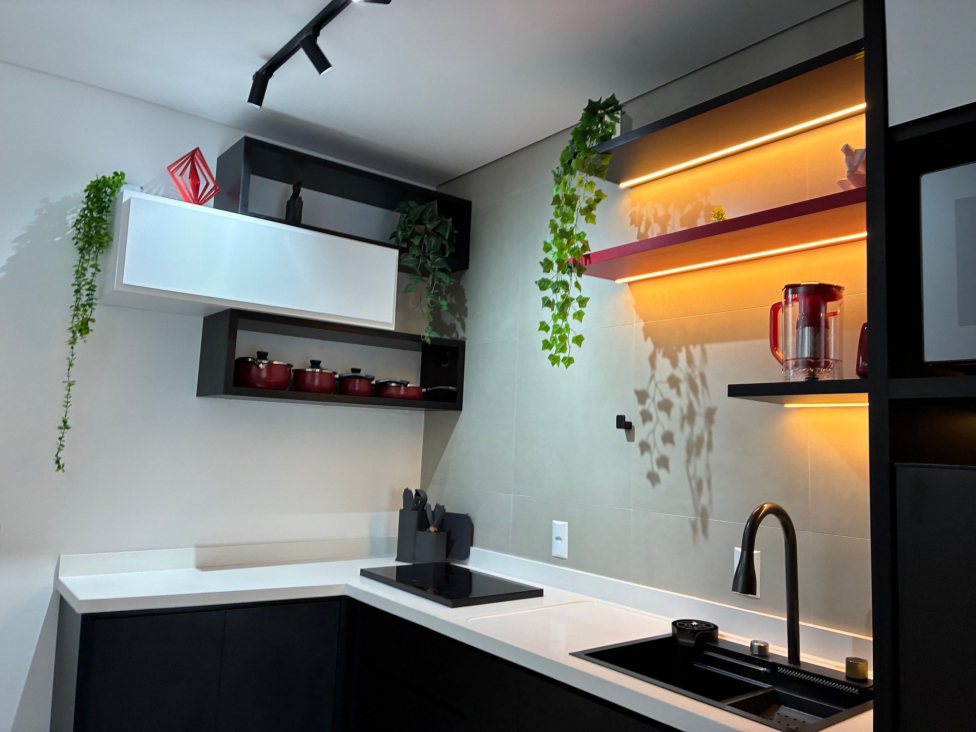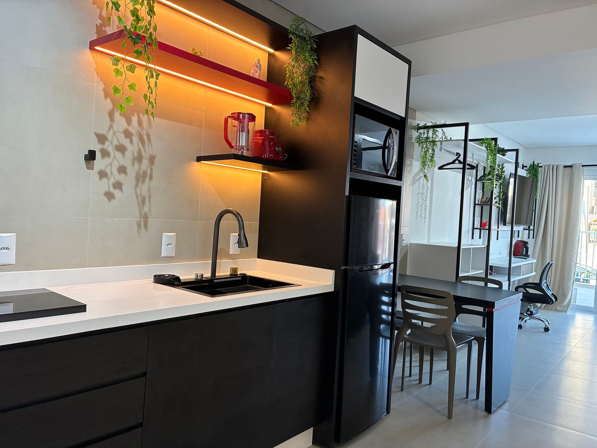 - Cozinha com geladeira, micro-ondas, sanduicheira, cafeteira elétrica, chaleira elétrica, liquidificador, panelas, louças e utensílios;