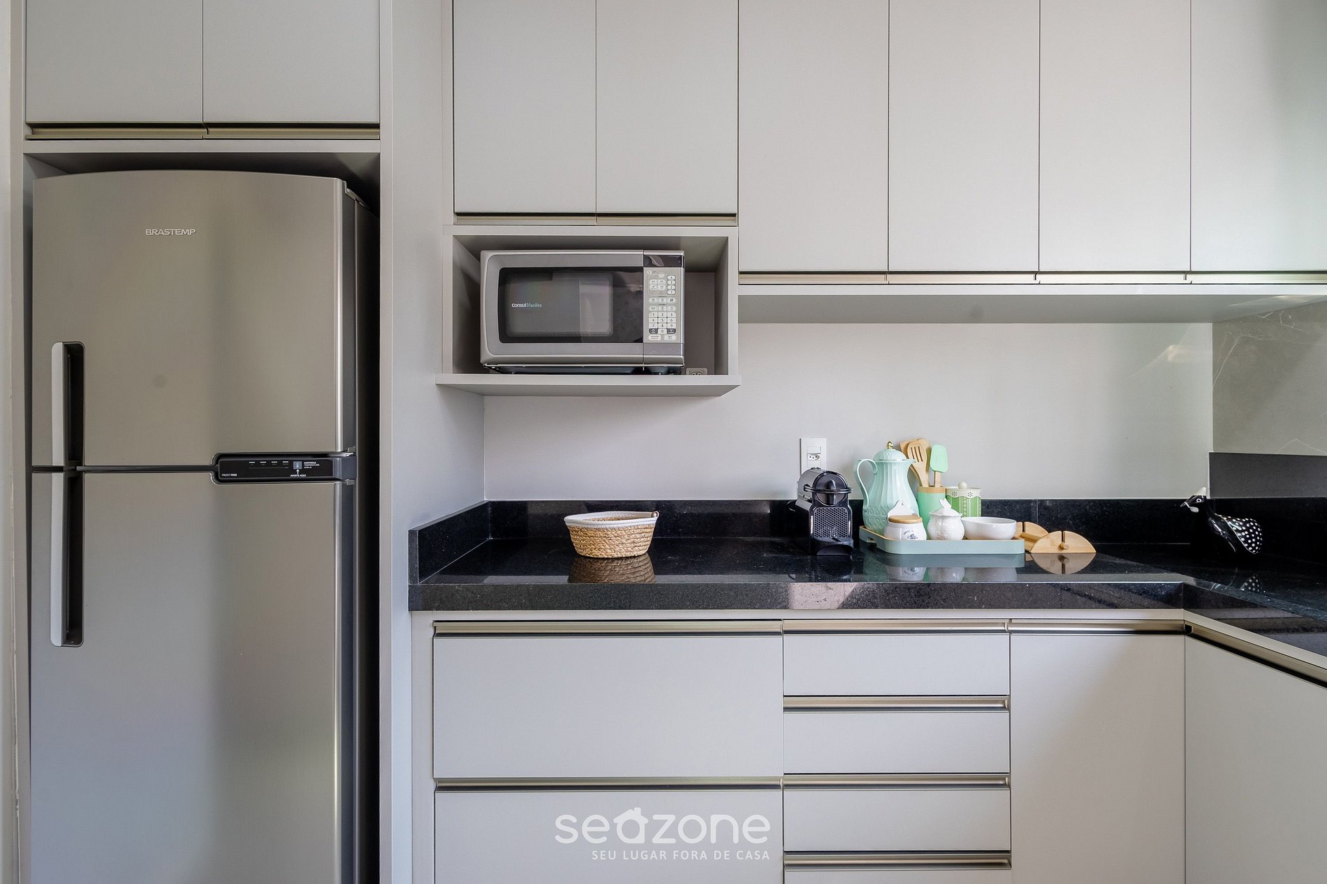 - Cozinha completa com geladeira, cooktop (gás), micro-ondas, sanduicheira, liquidificador, cafeteira elétrica, chaleira, taças de vinho, panelas, louças e utensílios;