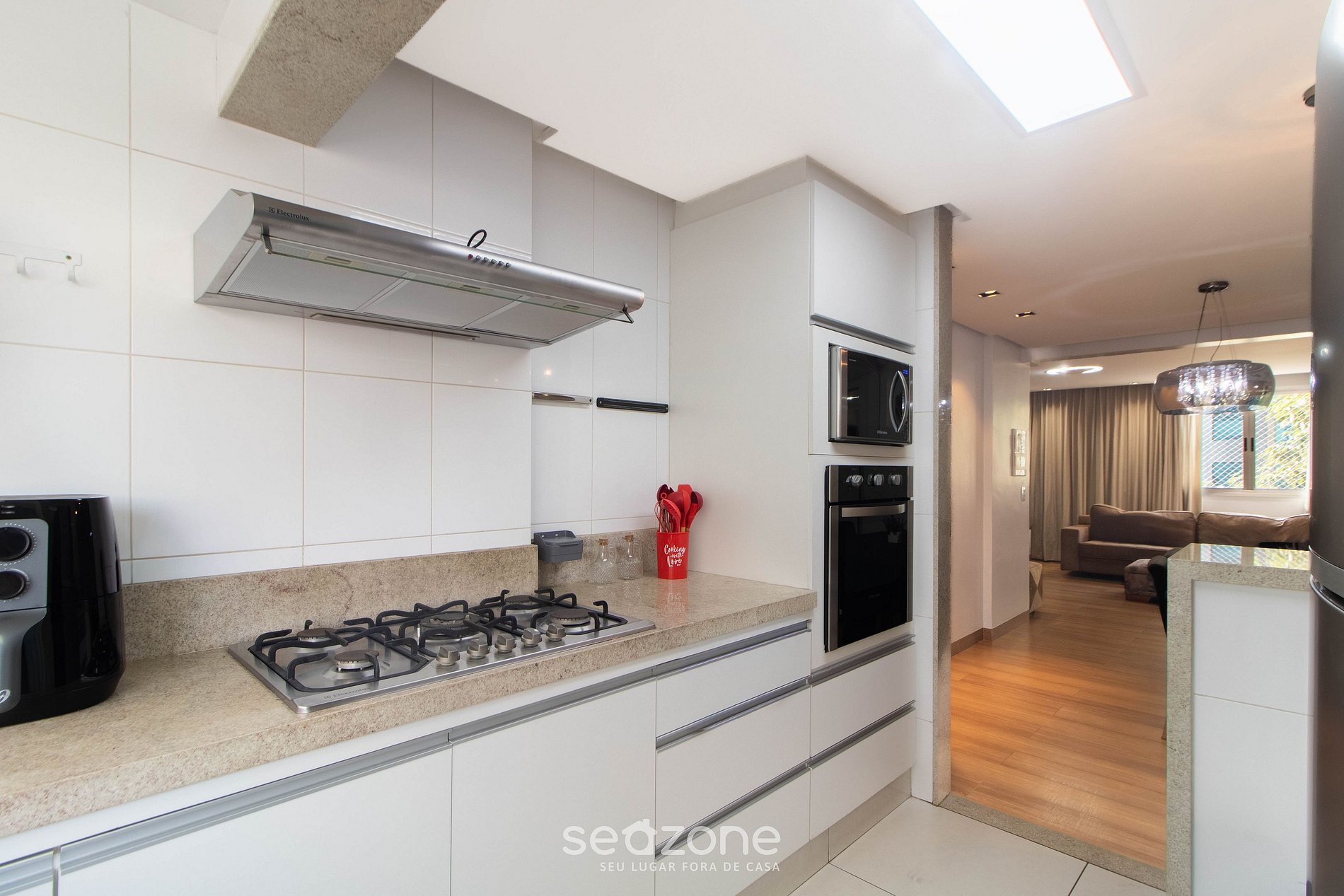 - Cozinha completa com geladeira, fogão cooktop (gás), forno elétrico, micro-ondas, sanduicheira, cafeteira elétrica, chaleira elétrica, liquidificador, lava louça, taças de vinho, panelas, louças e utensílios;