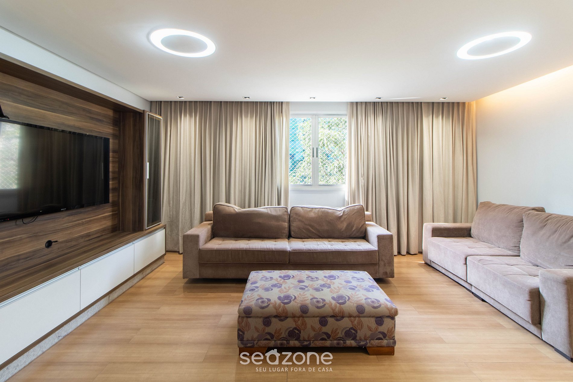 - Sala de estar com 2 sofás, ar-condicionado e Smart TV;