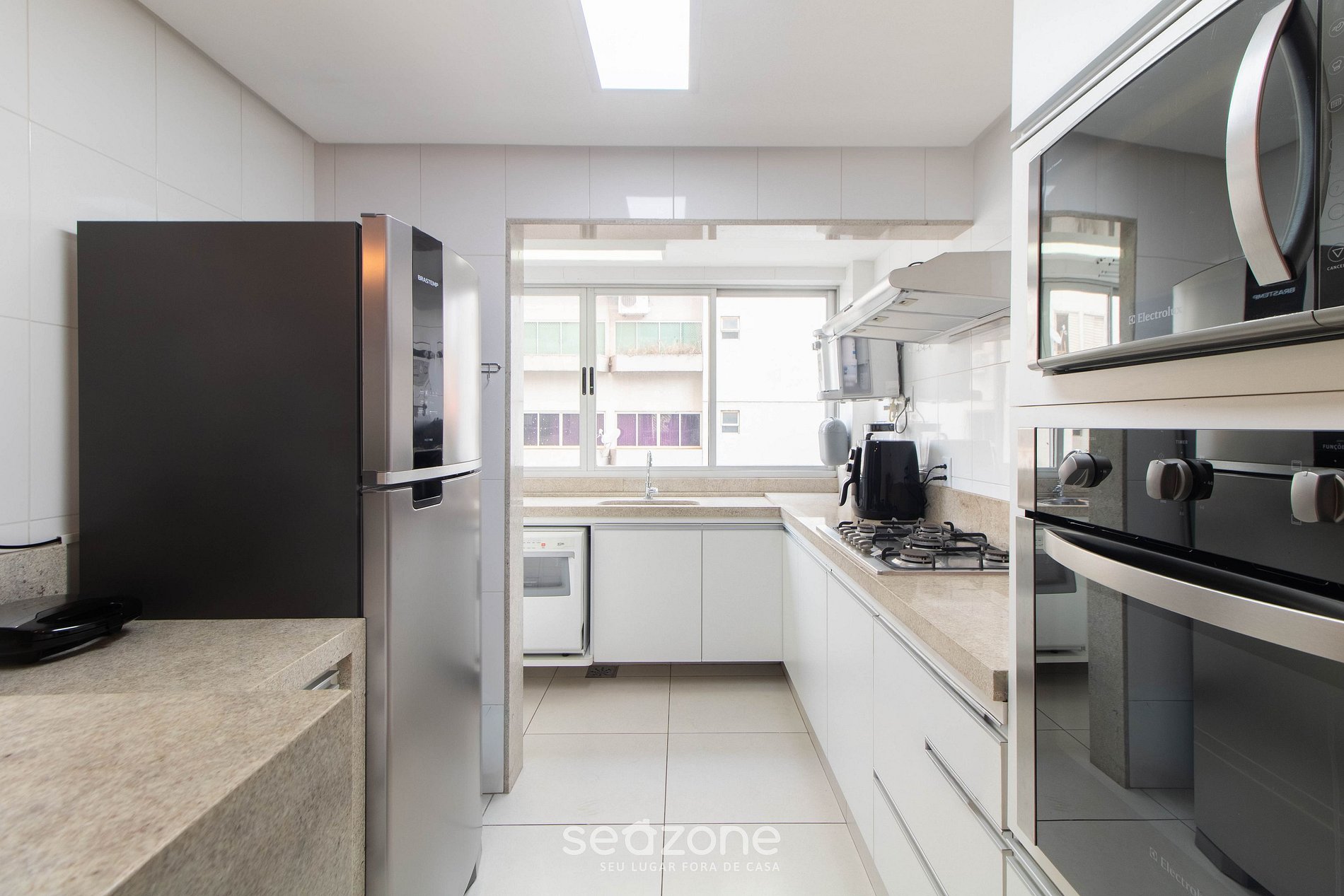 - Cozinha completa com geladeira, fogão cooktop (gás), forno elétrico, micro-ondas, sanduicheira, cafeteira elétrica, chaleira elétrica, liquidificador, lava louça, taças de vinho, panelas, louças e utensílios;