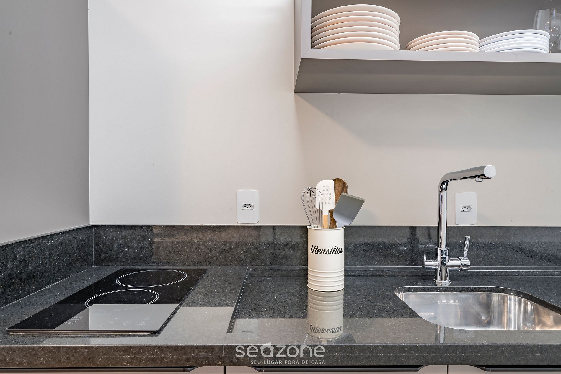 - Cozinha com geladeira, fogão cooktop, micro-ondas, sanduicheira, cafeteira, chaleira elétrica, liquidificador, panelas, louças e utensílios;