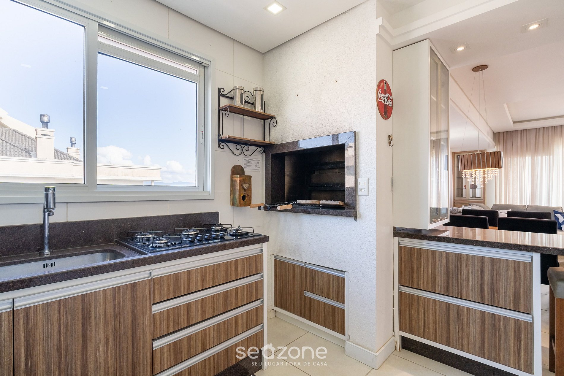- Cozinha completa com geladeira, cooktop (gás), forno elétrico, micro-ondas, sanduicheira, Kit café (suporte para filtro, garrafa térmica), chaleira, liquidificador, taças de vinho, panelas, louças e utensílios;