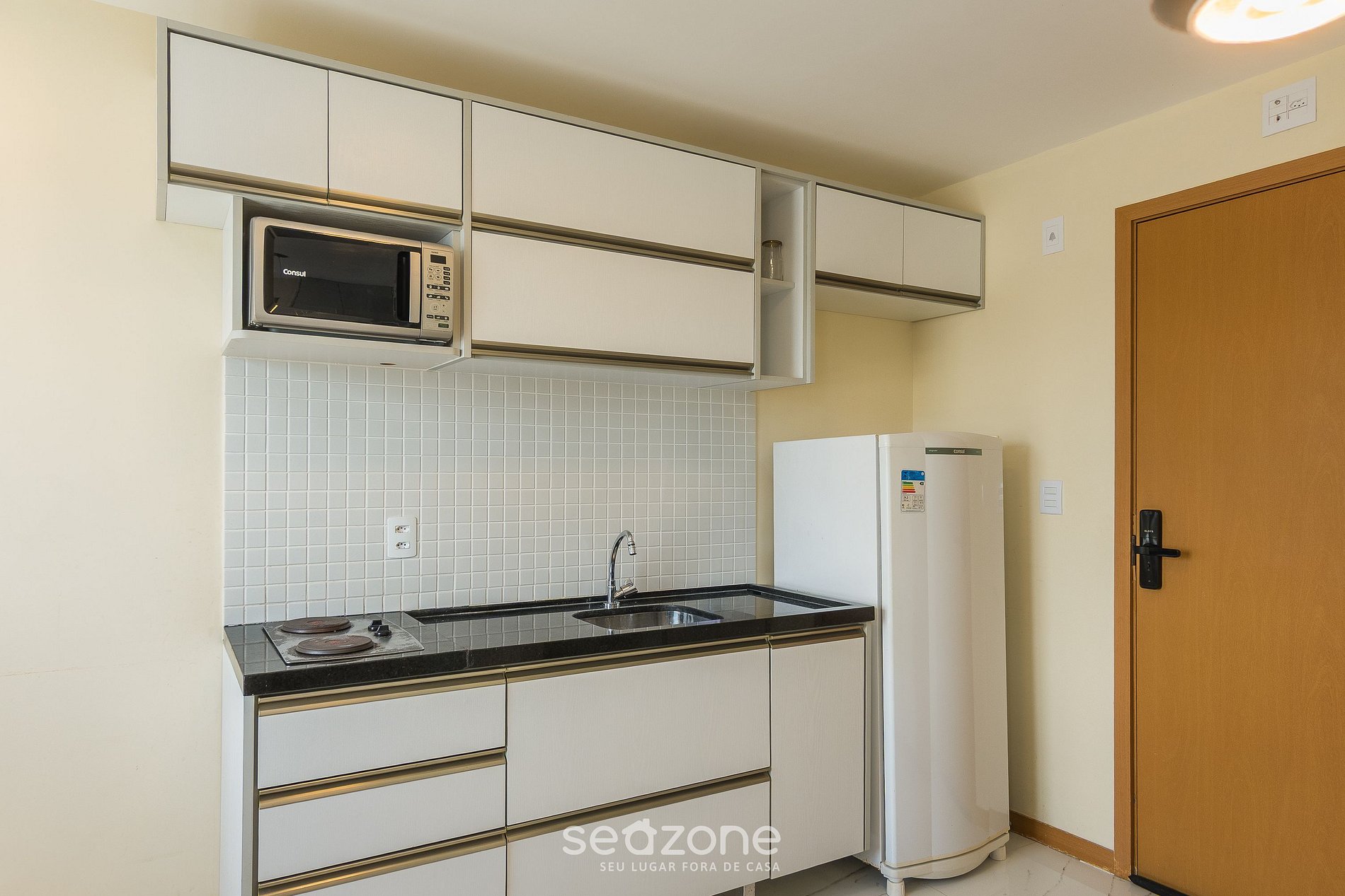 - Cozinha completa com geladeira, cooktop elétrico, micro-ondas, cafeteira elétrica, Kit café (suporte para filtro, garrafa térmica), chaleira, liquidificador, taças de vinho, panelas, louças e utensílios;