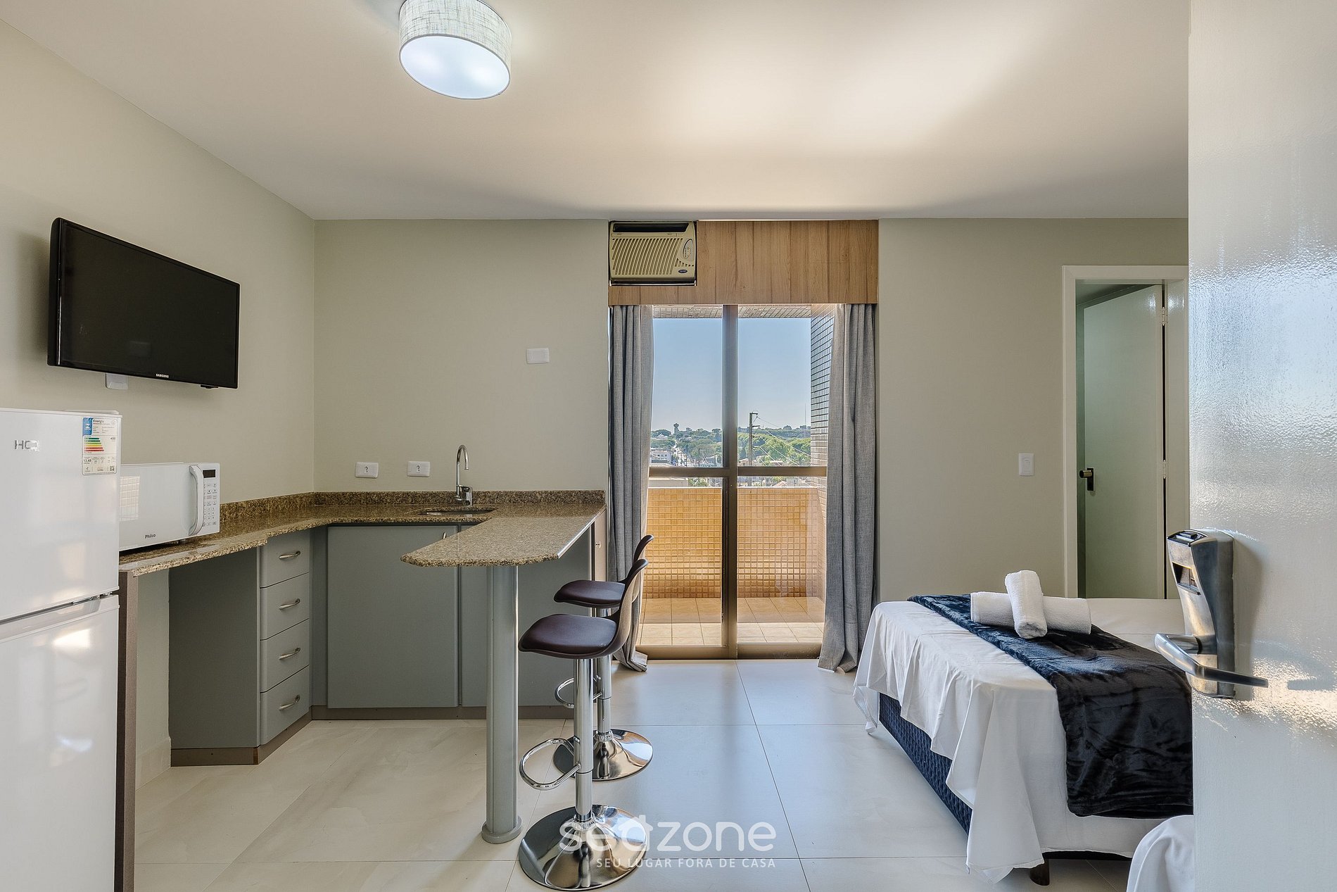 - Cozinha compacta com geladeira, sanduicheira, micro-ondas, Kit café (suporte para filtro, garrafa térmica), chaleira elétrica, taças de vinho e utensílios;