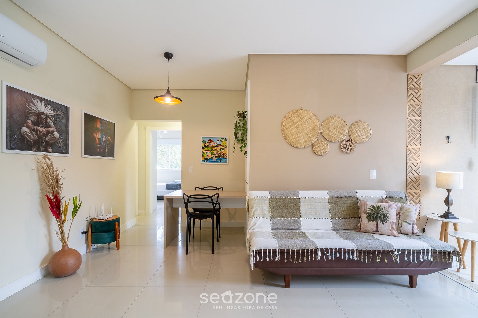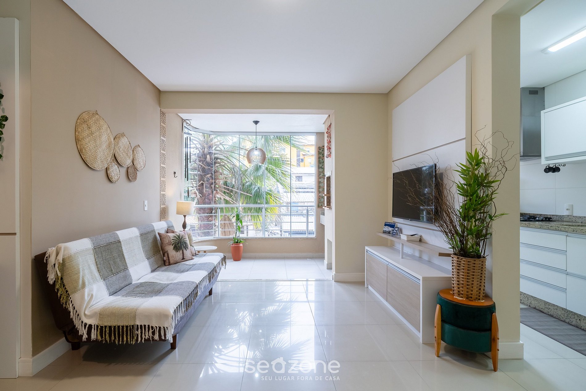 - Sala de estar com sofá, Smart TV e ar-condicionado;
