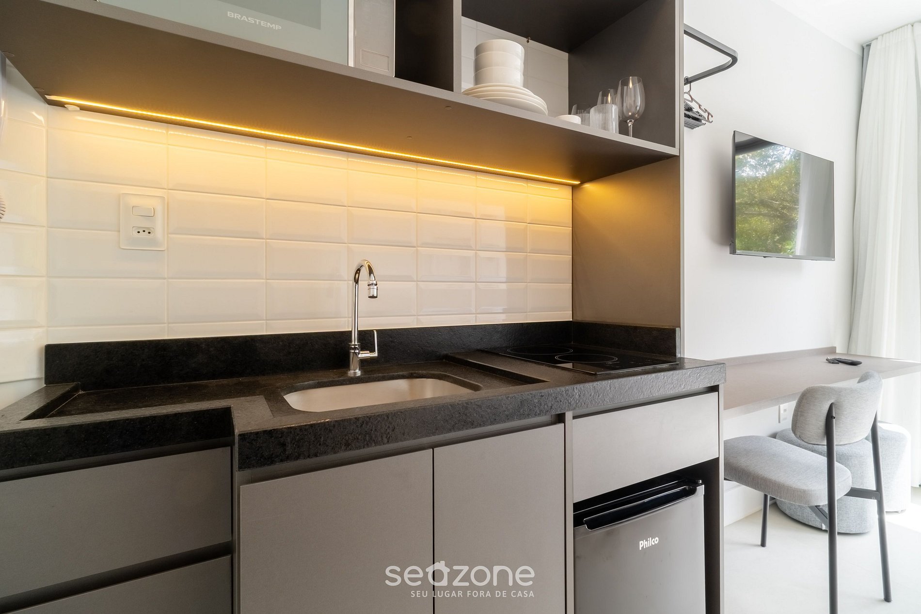 - Cozinha completa com frigobar, fogão cooktop (elétrico), micro-ondas, sanduicheira, cafeteira elétrica, chaleira, liquidificador, taças de vinho, panelas, louças e utensílios;