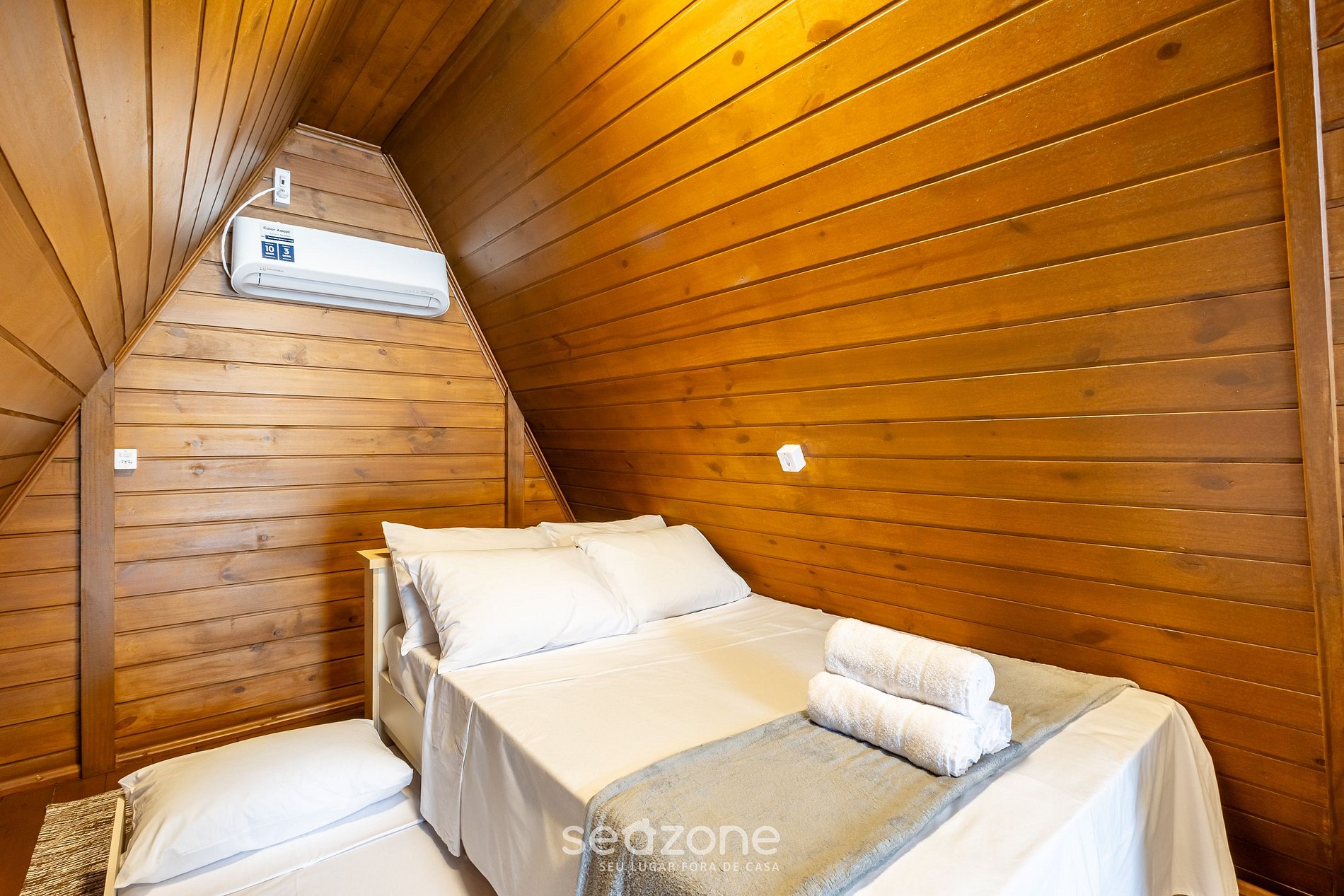 - 1 quarto com cama de casal localizado no mezanino, cama auxiliar de solteiro, armário e ar-condicionado;