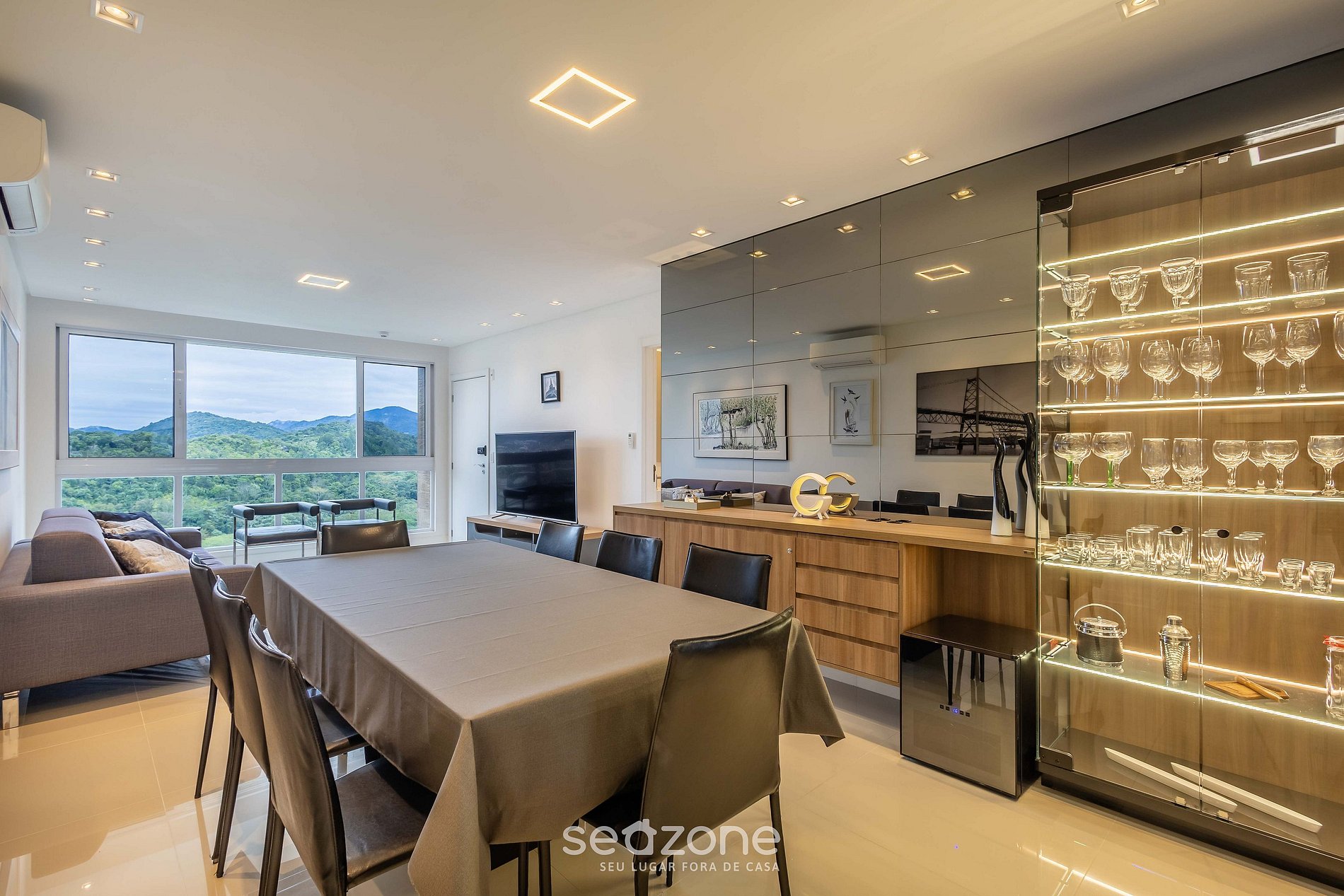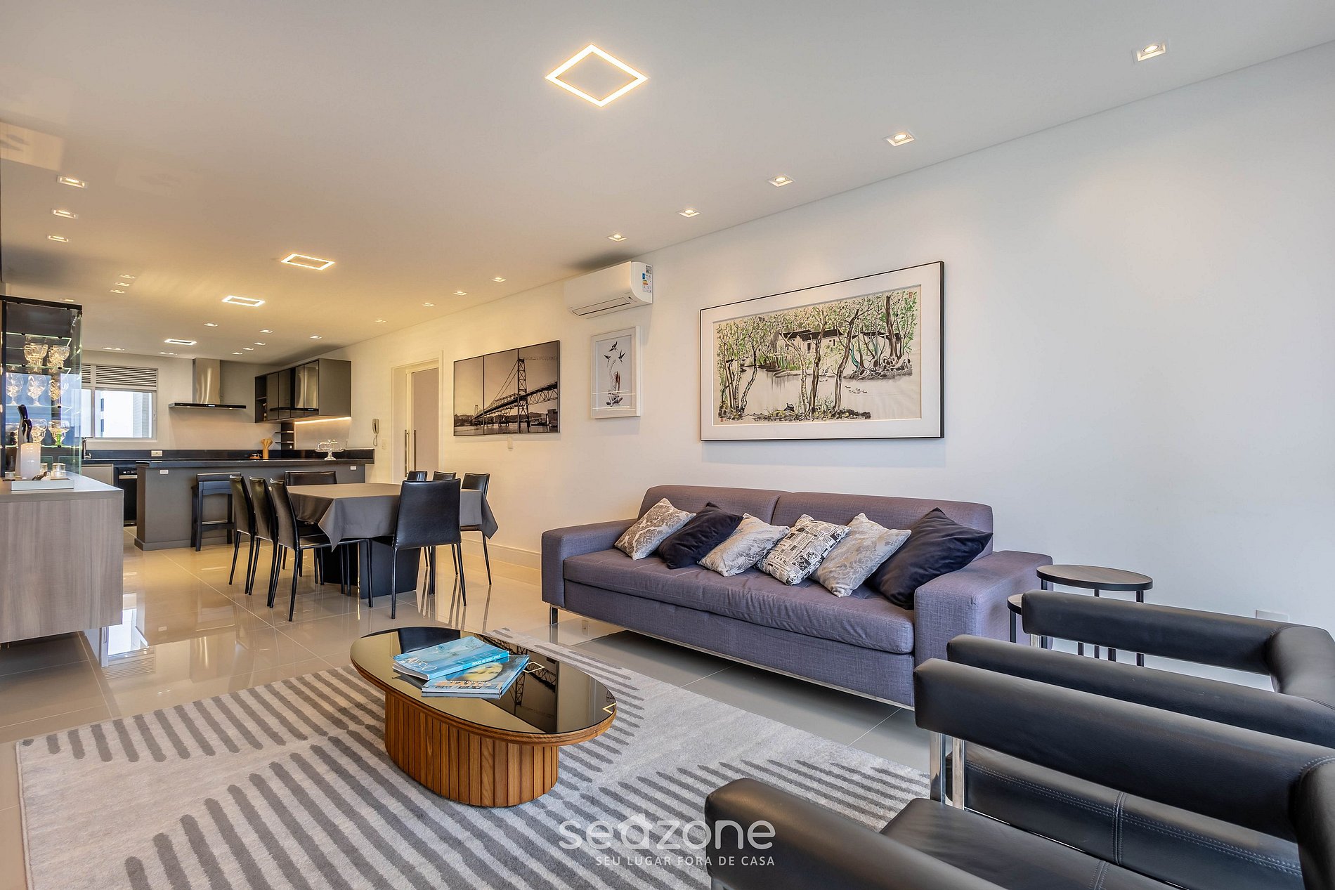- Sala de estar com Smart TV Wi-Fi 65", sofá, poltronas e ar-condicionado;