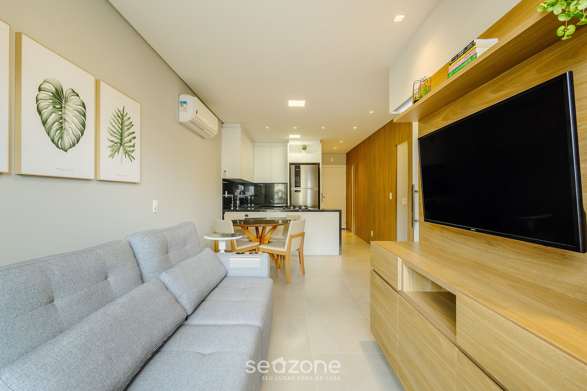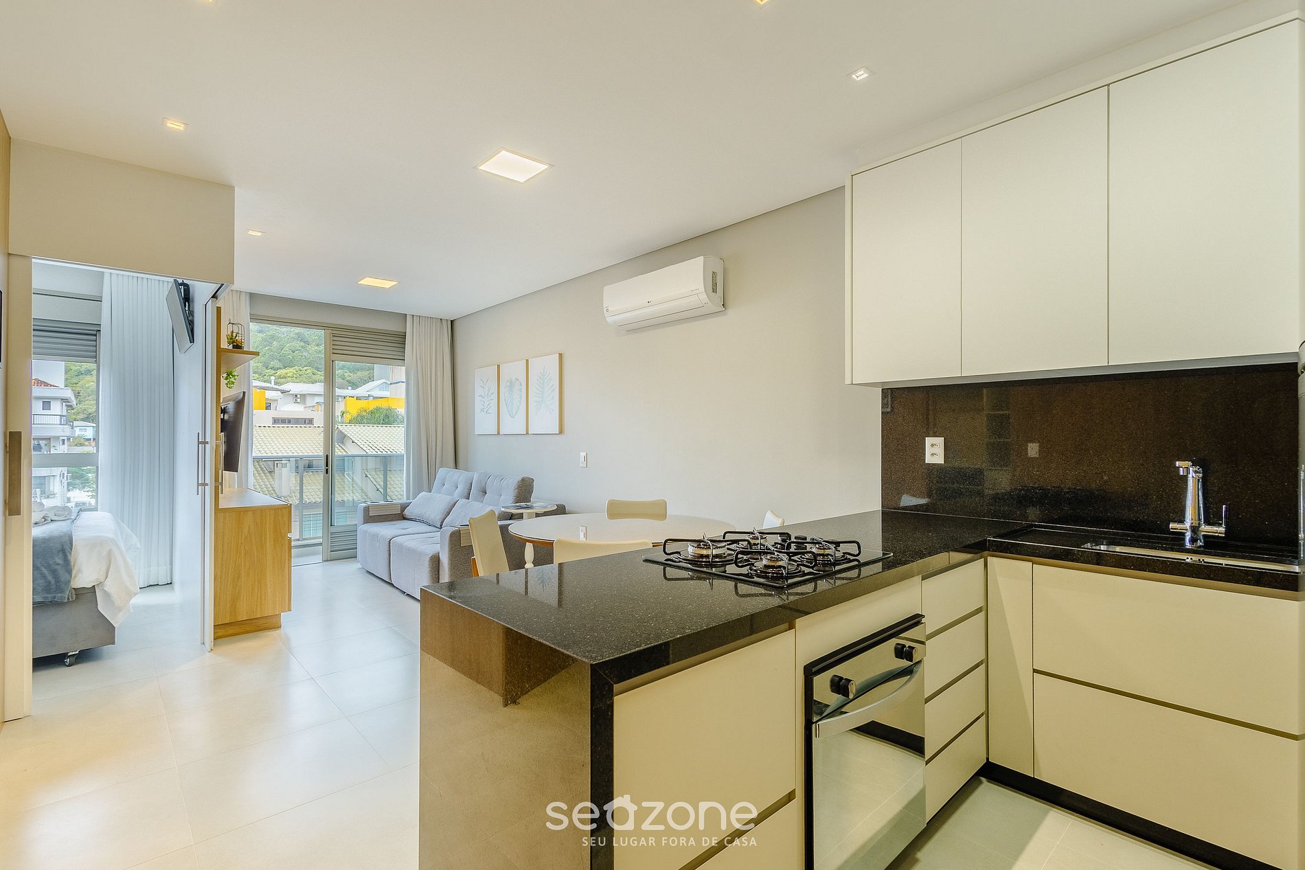 - Sala de estar com Sofá, cortinas blackout, Smart TV e ar-condicionado;