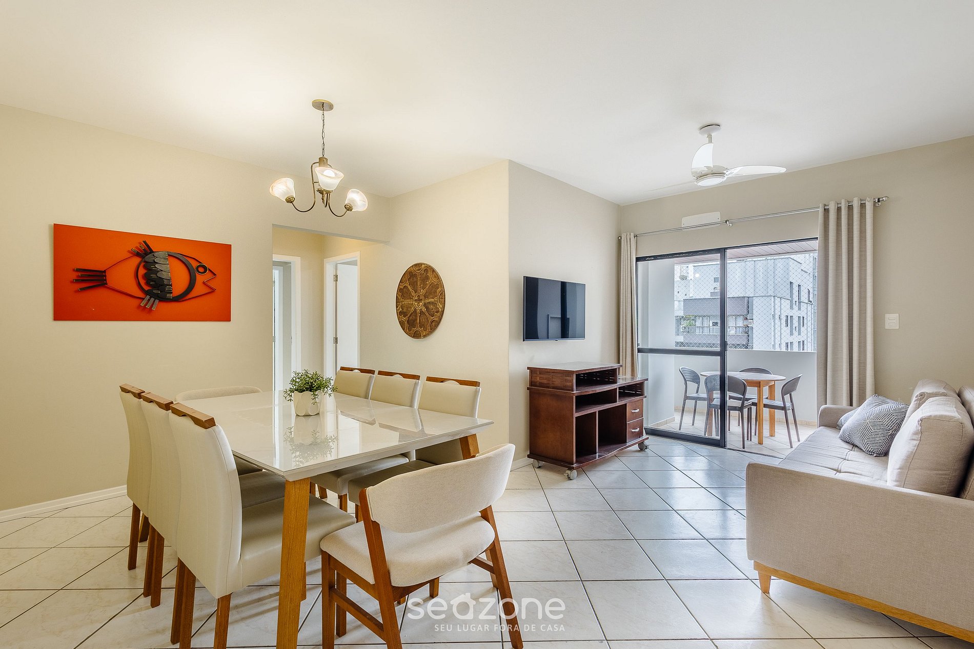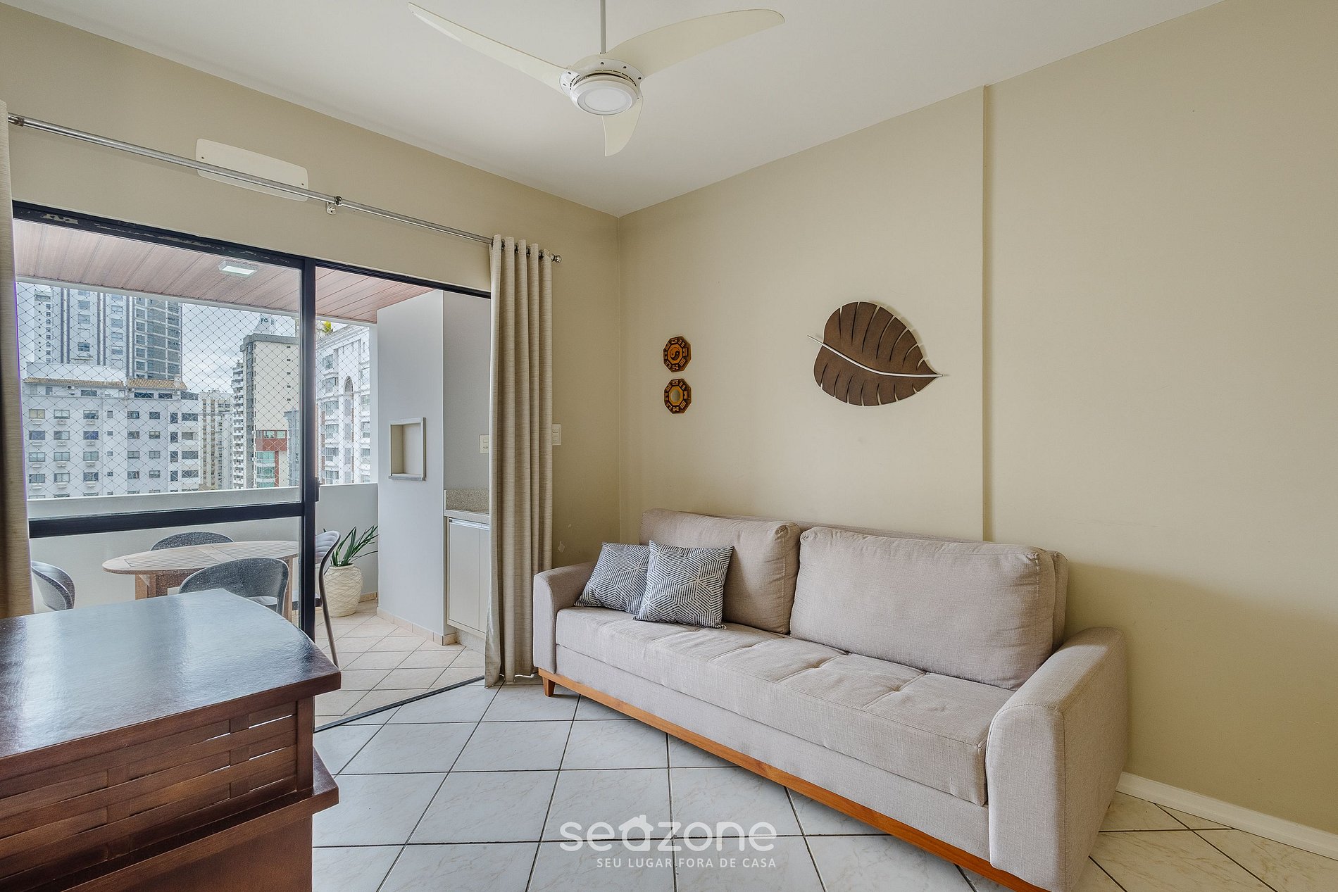 - Sala com sofá, Smart TV e ventilador de teto;