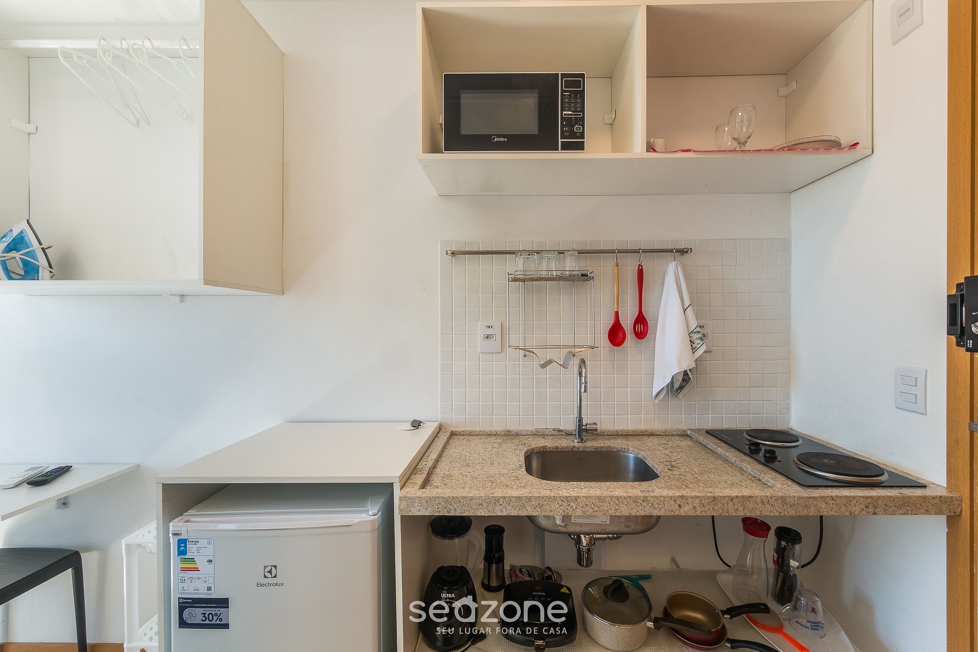 - Cozinha completa com frigobar, fogão cooktop (elétrico), microondas, sanduicheira, cafeteira elétrica, liquidificador, louças e utensílios;