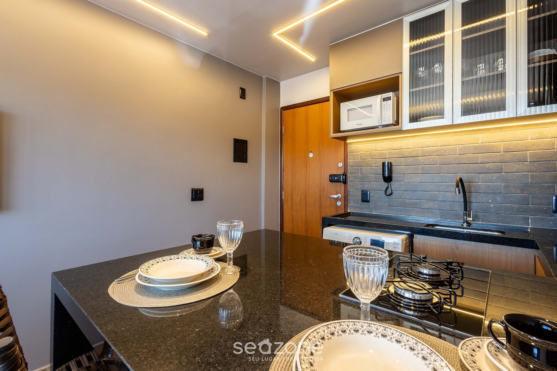 - Cozinha completa com frigobar, fogão cooktop (gás), micro-ondas, sanduicheira, cafeteira elétrica, chaleira, liquidificador, taças de vinho, panelas, louças e utensílios;