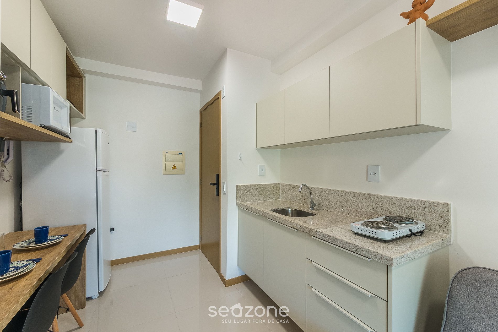 - Cozinha completa com geladeira, fogão cooktop elétrico, microondas, sanduicheira, cafeteira elétrica, liquidificador, panelas, taças, panelas, louças e utensílios;