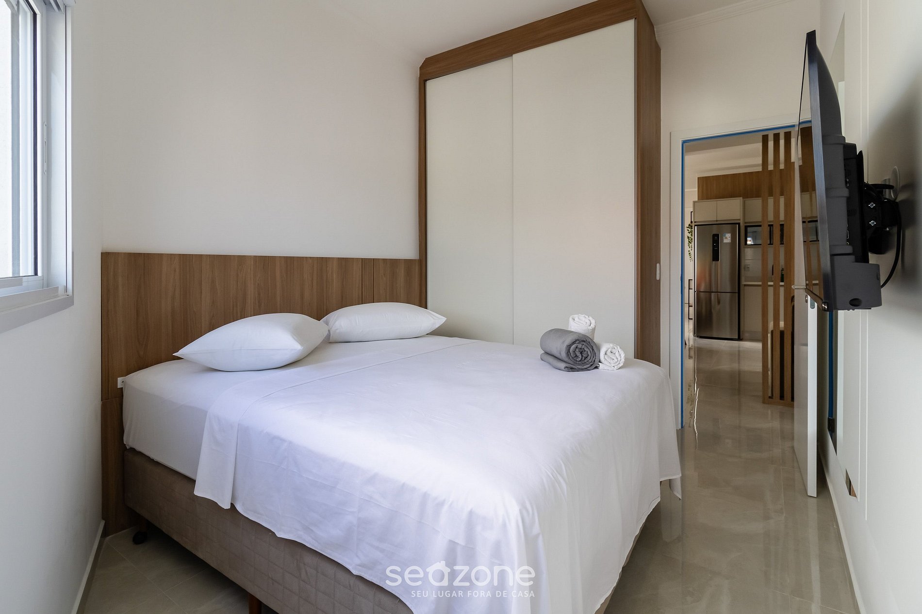 - 1 Quarto com cama de casal queen size, Smart TV, armário e ar-condicionado;