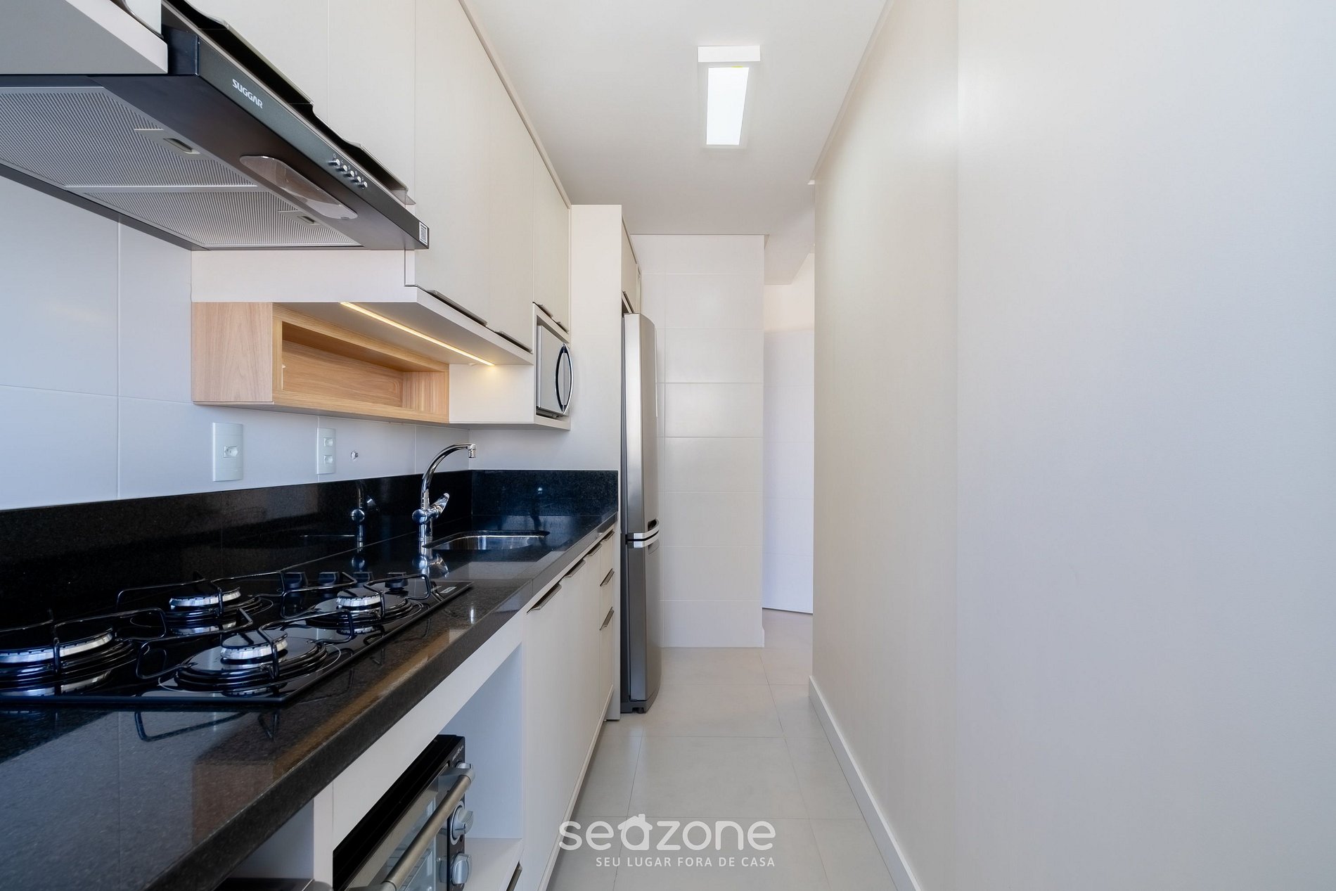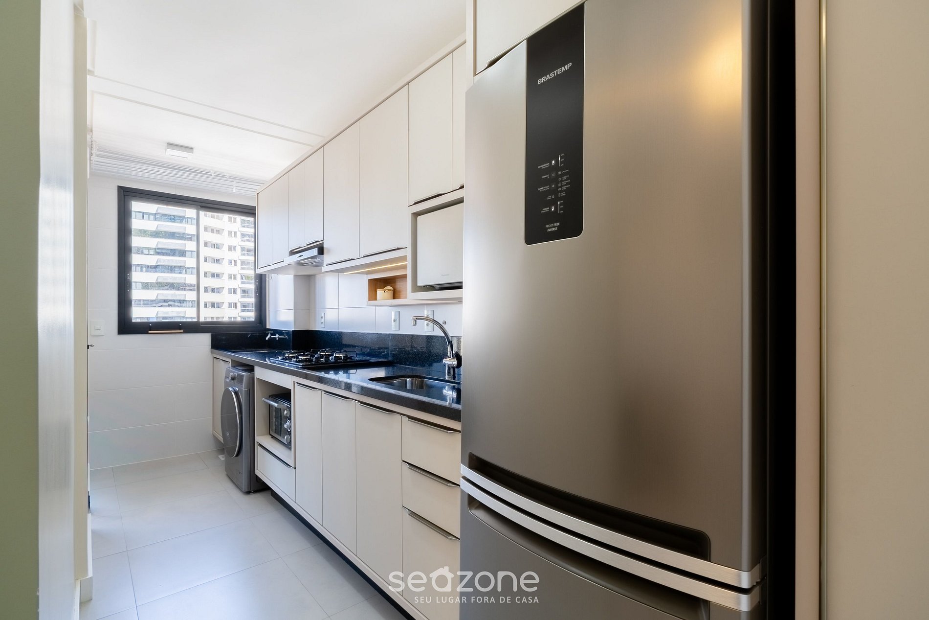 - Cozinha completa com geladeira, fogão cooktop (gás), forno elétrico, microondas, sanduicheira, cafeteira elétrica, chaleira elétrica, liquidificador, taças de vinho, panelas, louças e utensílios;