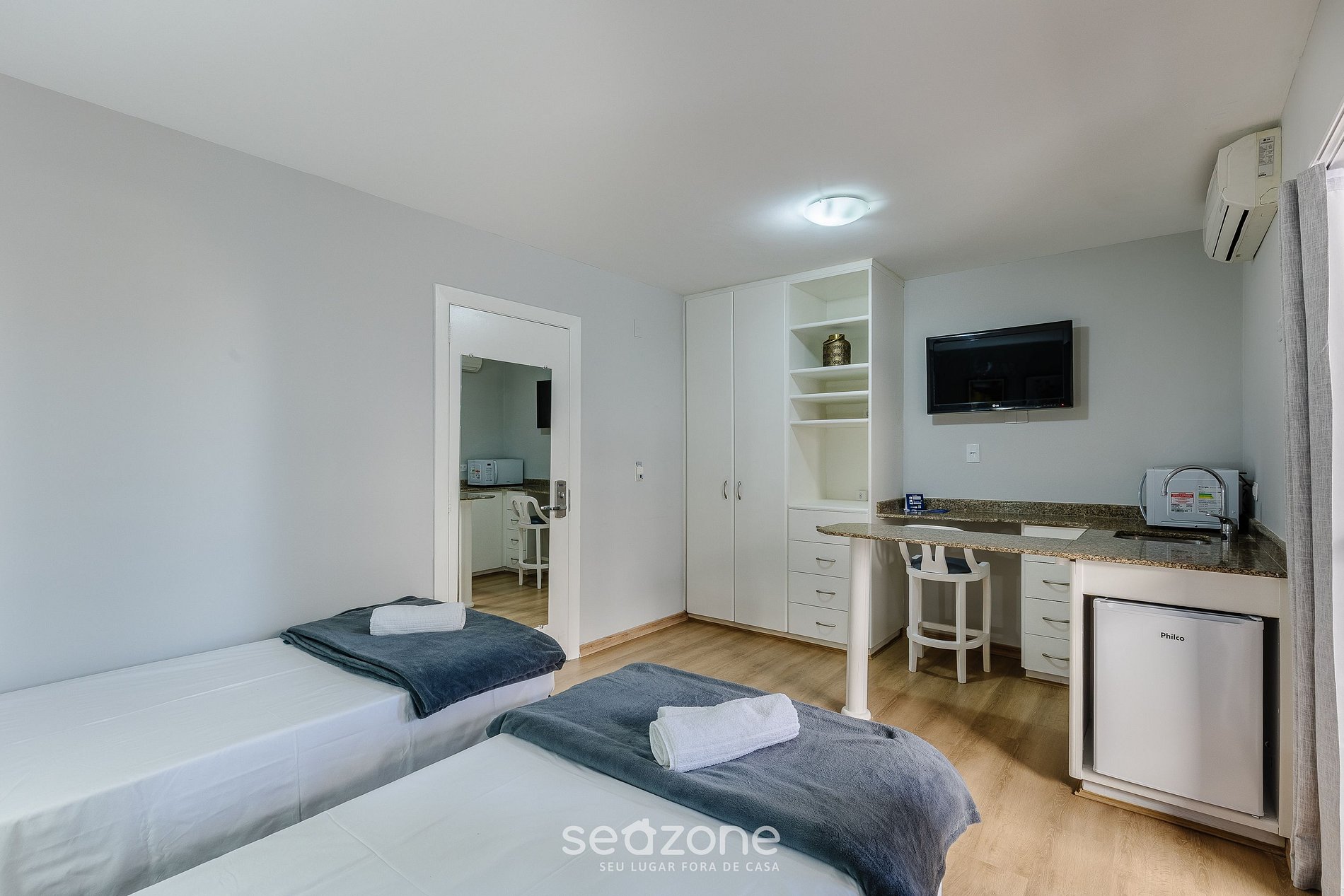 Em pleno Alto da XV, a poucos minutos do Jardim Botânico de Curitiba, este studio é totalmente equipado com duas camas de solteiro, ar-condicionado, TV, Wi-Fi de alta velocidade, cozinha compacta, e bancada versátil para jantar ou trabalho. A varanda revela uma vista urbana inspiradora. No condomínio: piscina coberta e aquecida e salão de jogos.