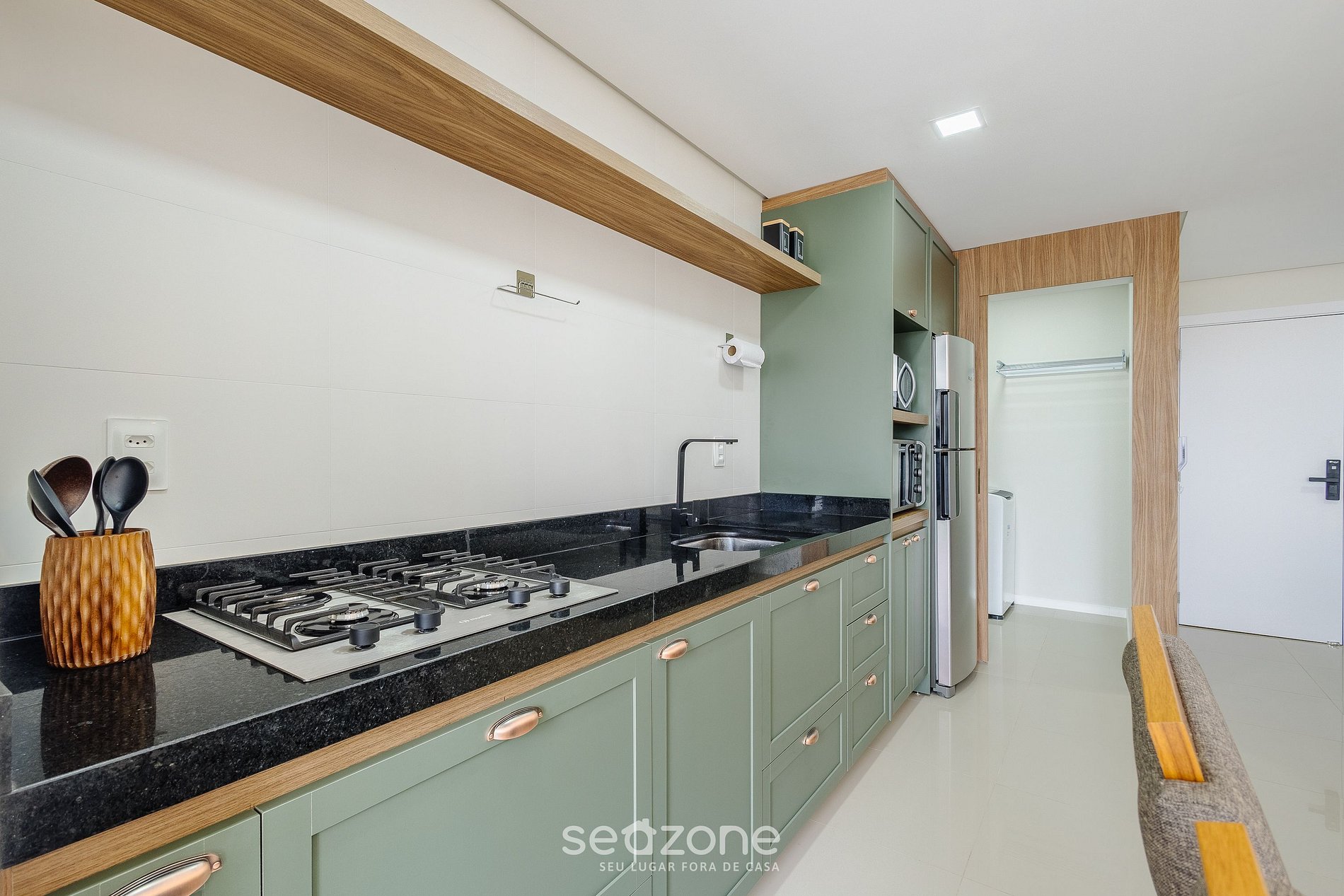 - Cozinha completa com geladeira, fogão cooktop (gás), forno elétrico, micro-ondas, sanduicheira, Kit café (suporte para filtro, garrafa térmica), chaleira elétrica, liquidificador, taças de vinho, panelas, louças e utensílios;