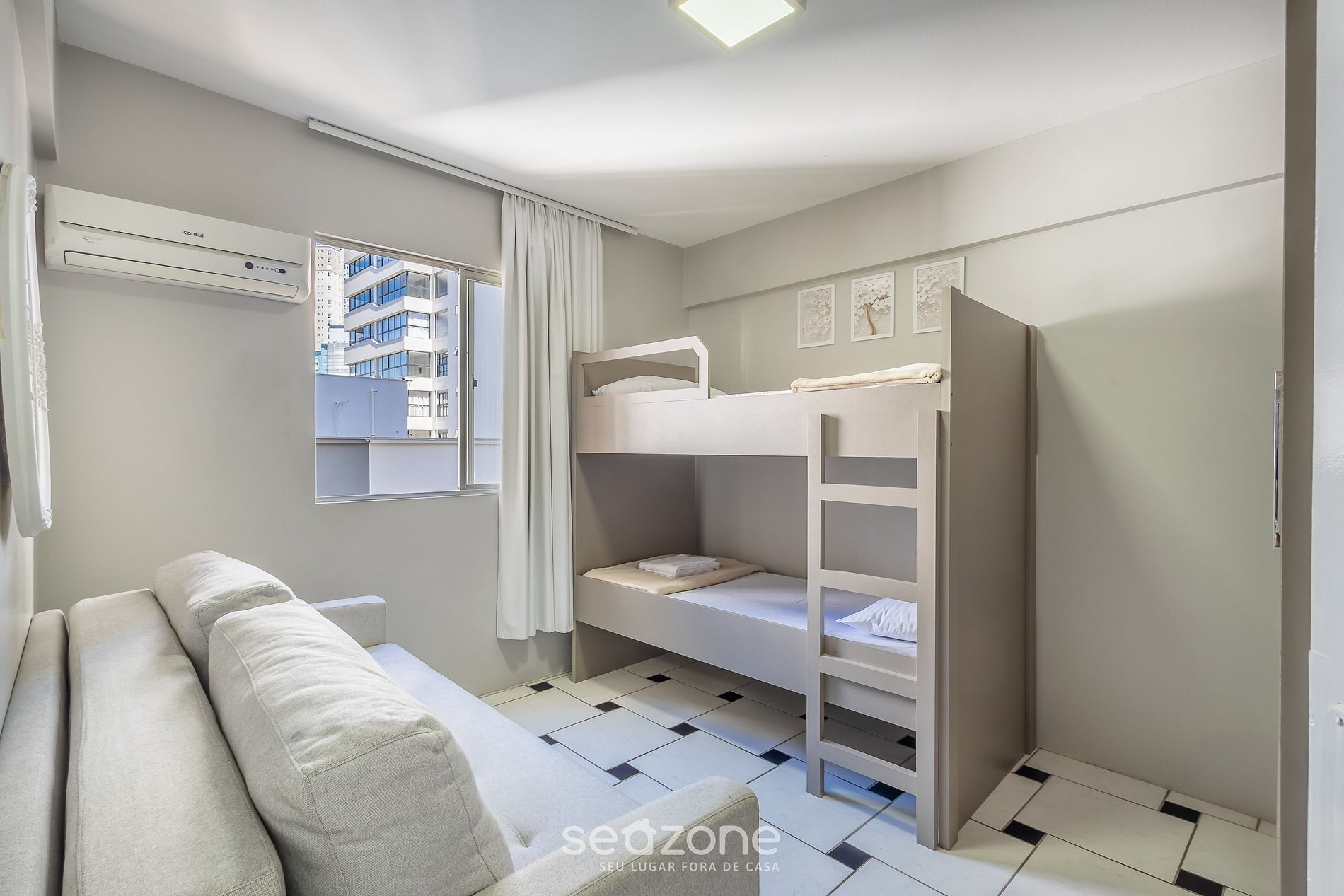 - 1 quarto com sofá-cama de casal, beliche, armário e ar-condicionado;