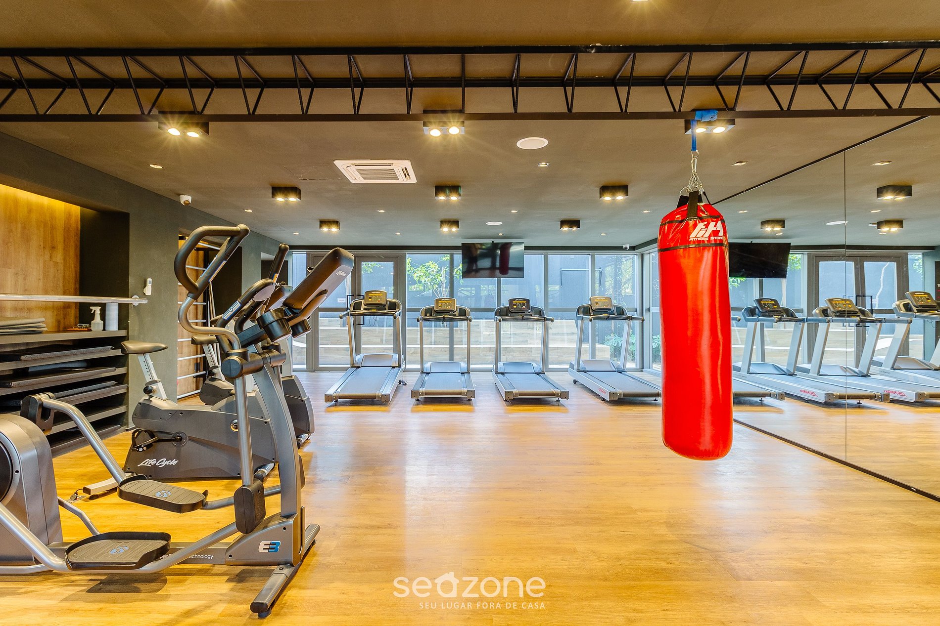 Para a sua comodidade, nosso condomínio oferece uma infraestrutura completa: piscina, academia para manter a sua rotina de exercícios, um mini mercado para suas necessidades diárias e a praticidade do self check-in para uma chegada tranquila e sem complicações.