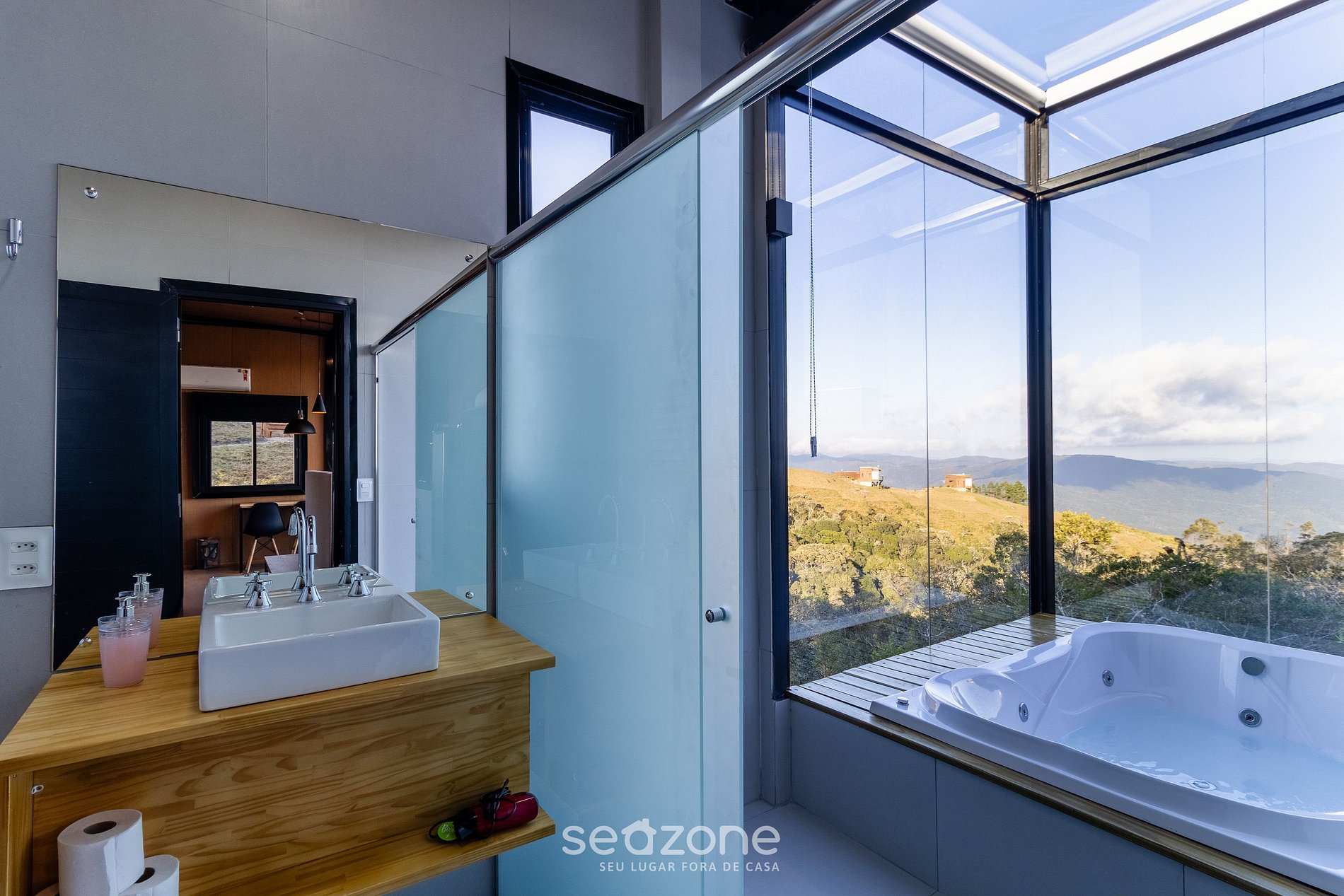 - Jacuzzi particular com hidromassagem e teto de vidro e janelas panorâmicas;