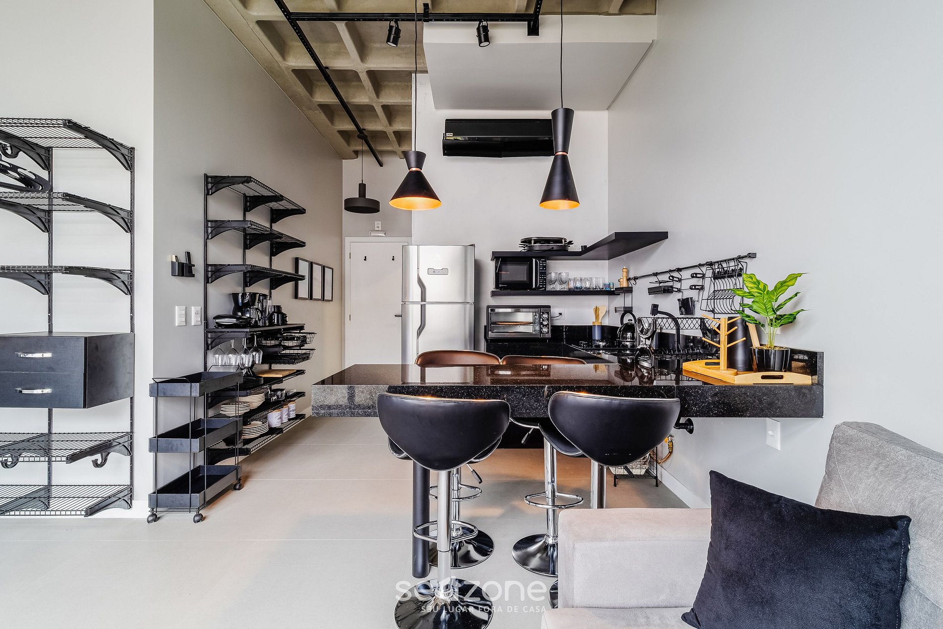 - Espaço em conceito aberto integrando ambientes de quarto, sala e cozinha;