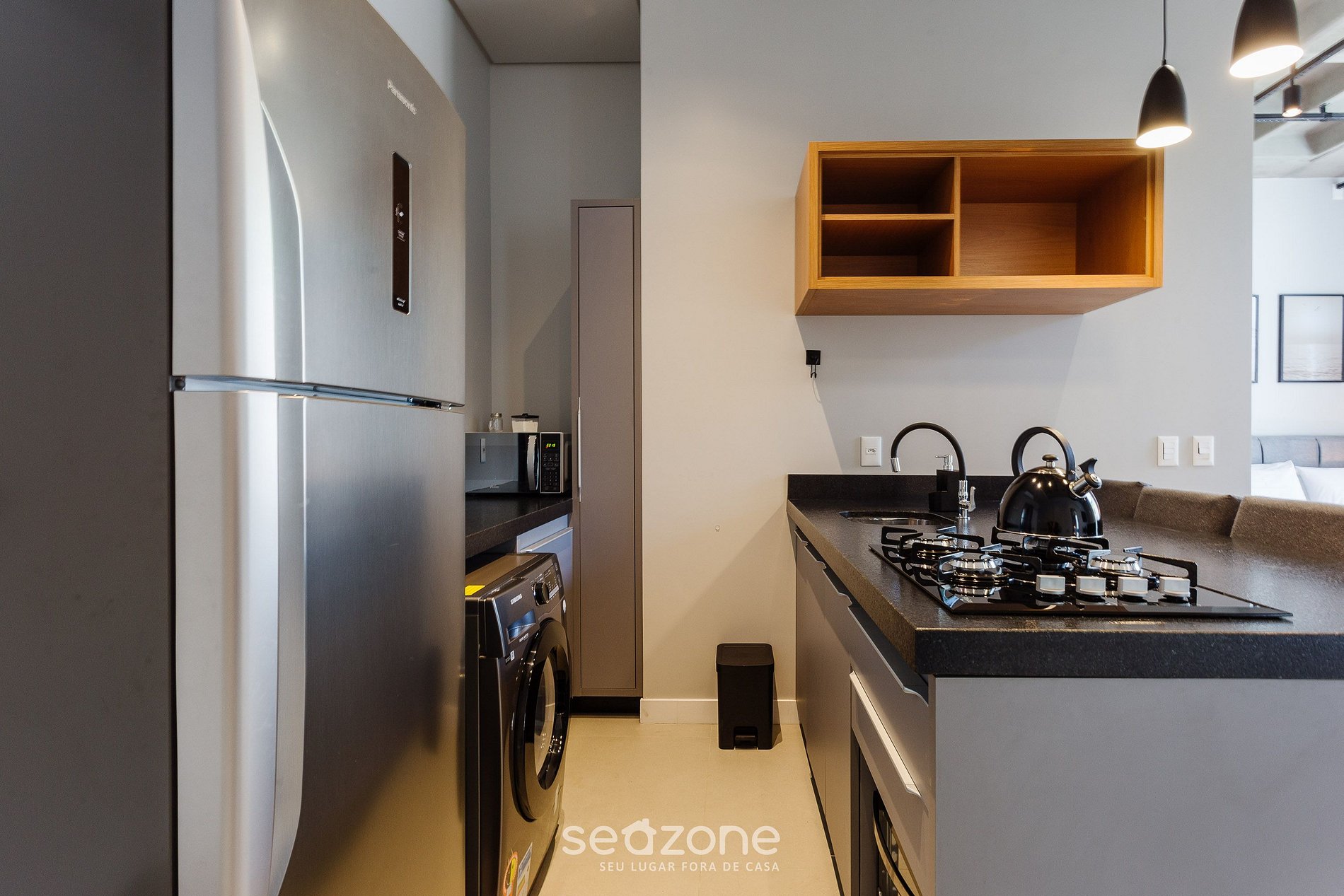 - Cozinha integrada completa com geladeira, fogão cooktop, forno elétrico, micro-ondas, sanduicheira, cafeteira elétrica, chaleira convencional, chaleira elétrica, liquidificador, panelas, louças e utensílios;