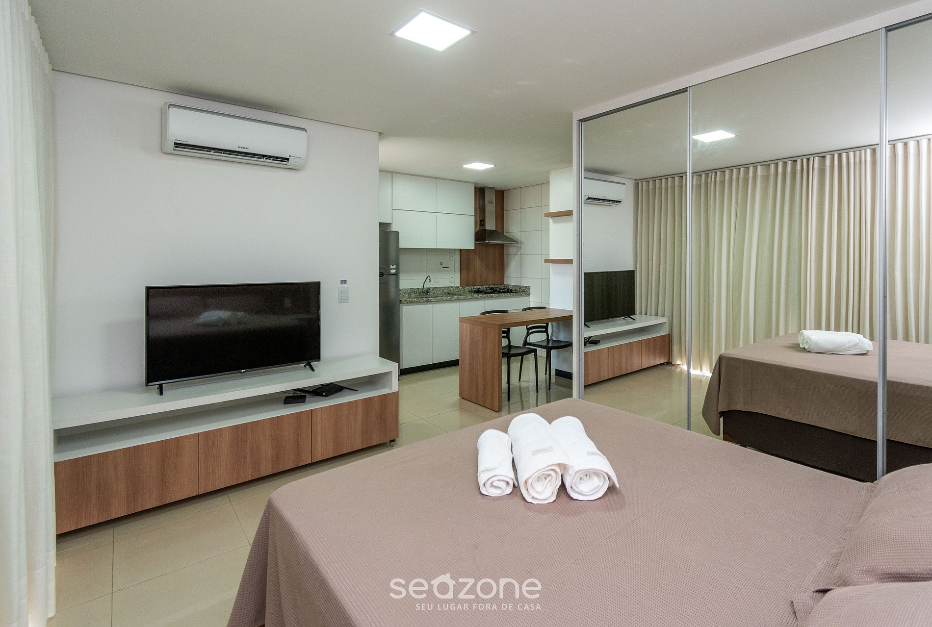 Tenha uma estadia completa neste flat moderno em Goiânia, Setor Bueno. Cozinha equipada, TV, Wi-Fi de alta velocidade e check-in sem chave e ar condicionado para você ter o máximo de conforto.