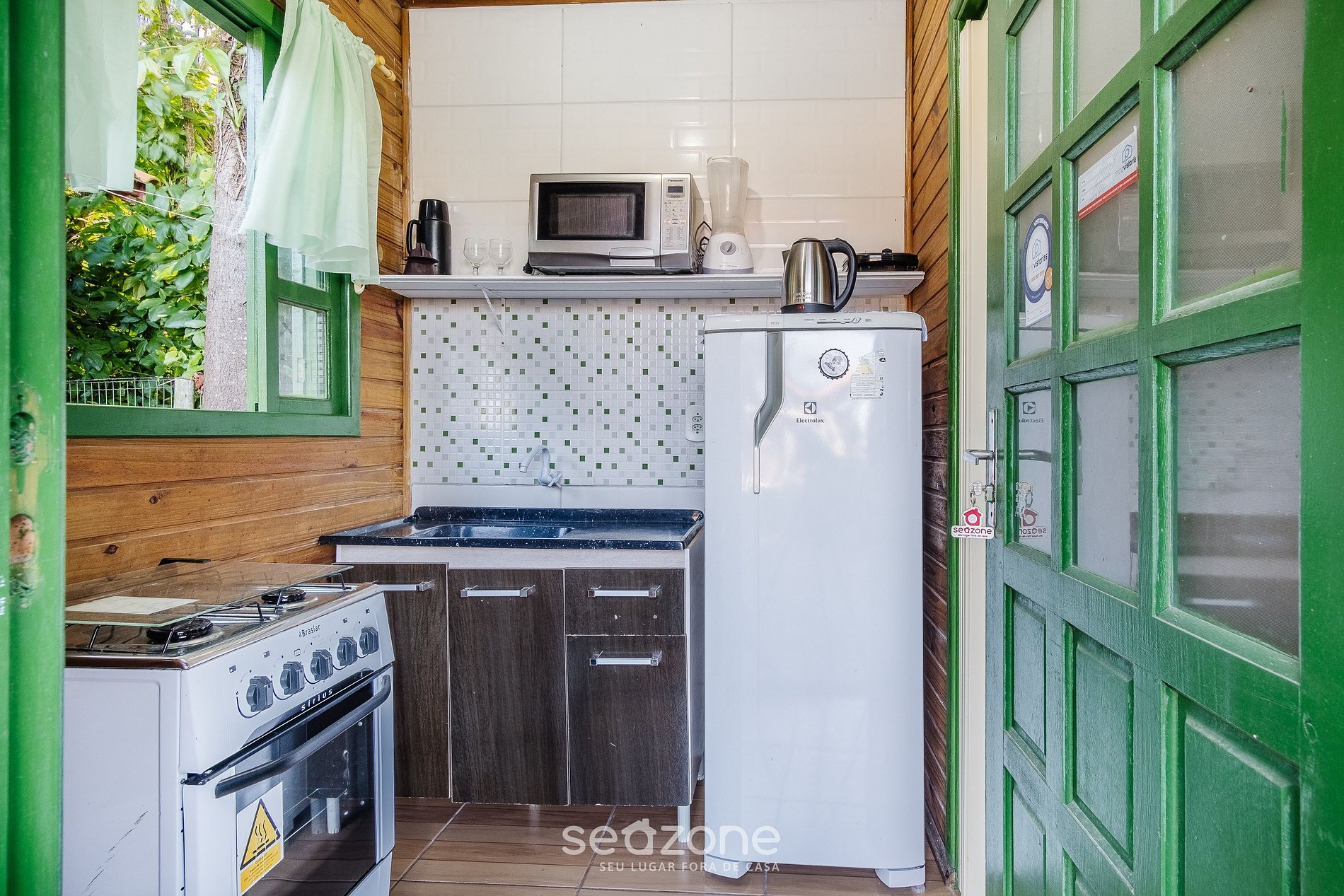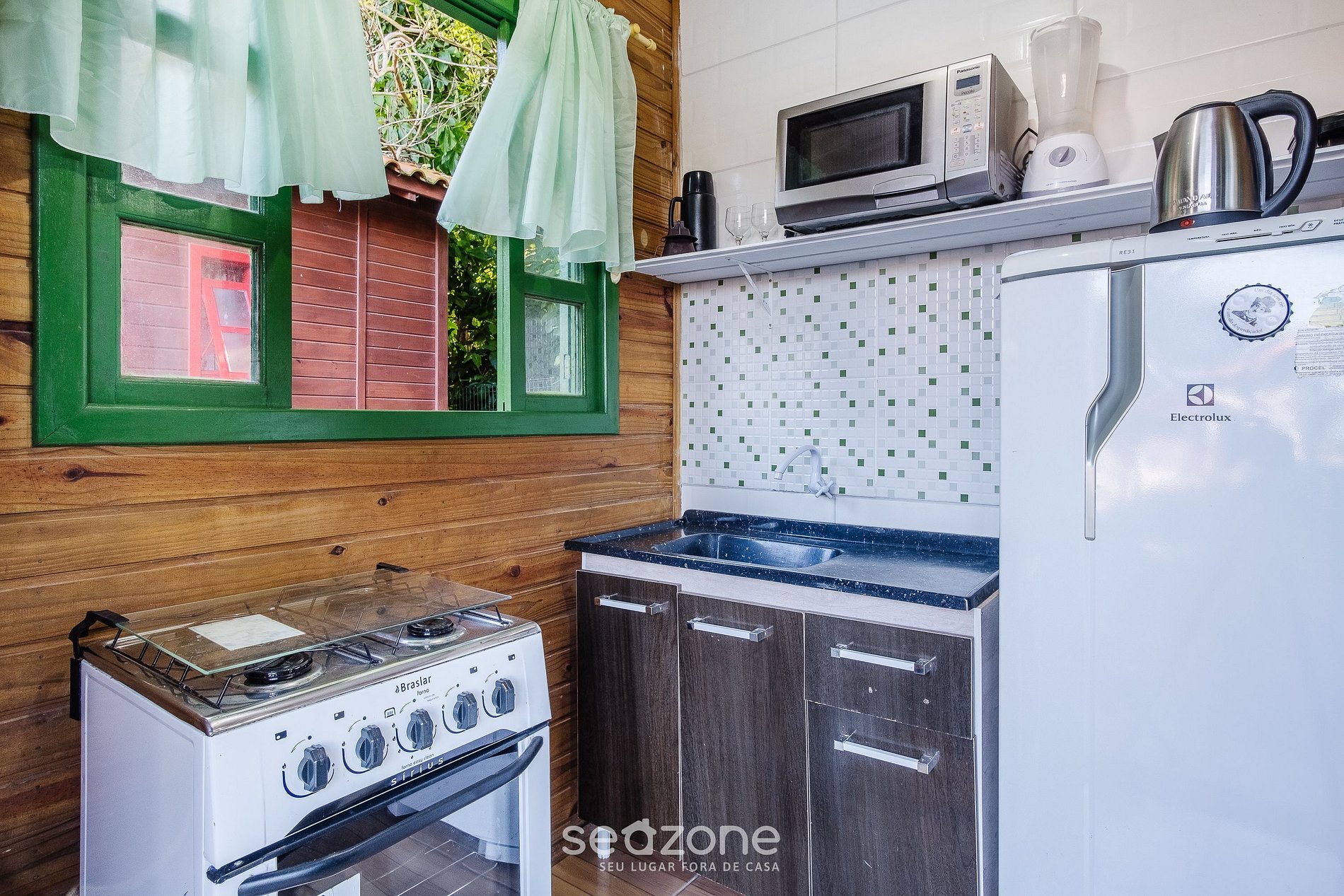 - Cozinha completa com geladeira, fogão, microondas, sanduicheira, chaleira elétrica, liquidificador, panelas, louças e utensílios;