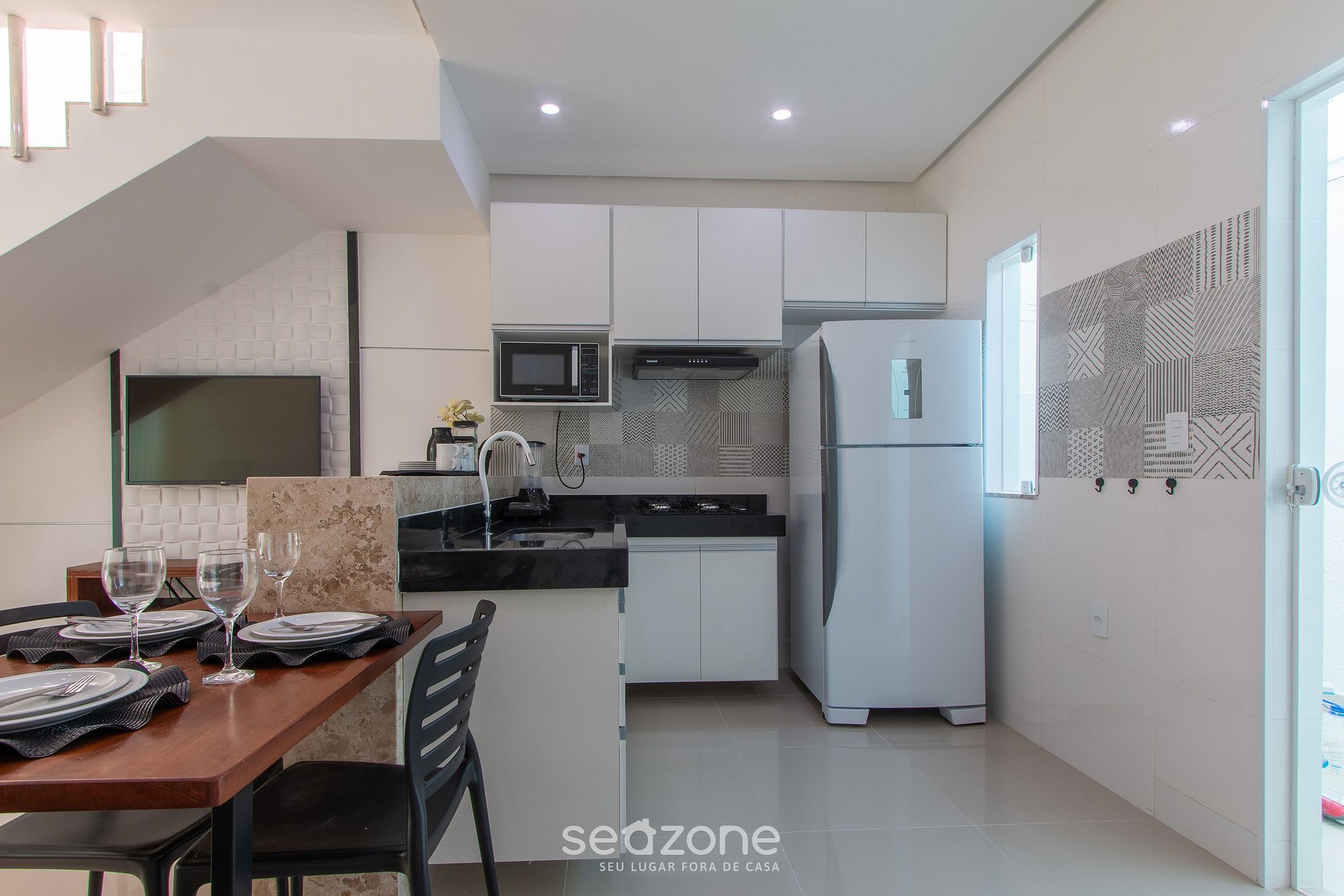 - Cozinha com geladeira, fogão cooktop, depurador de ar, micro-ondas, airfryer de 12 litros, cafeteira, chaleira, sanduicheira, liquidificador, panelas, louças e utensílios;
